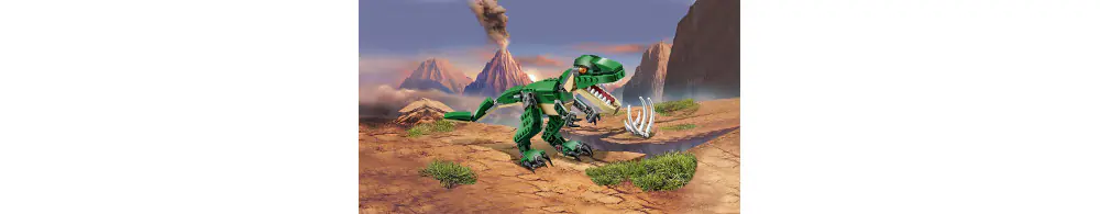 Ten model dinozaura jest ciemnozielono-beżowego koloru i ma jasne, pomarańczowe oczy. Otwórz mu paszczę, a zobaczysz ostre jak brzytwa zębiska. Ustaw szpony w odpowiedniej pozycji, a potem zrób to samo z głową i ogonem. W zestawie znajdziesz także szczątki ostatniej ofiary T-Rexa! Model można przerobić, budując inne Potężne dinozaury: mocarnego triceratopsa lub przerażającego pterodaktyla.