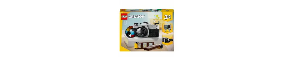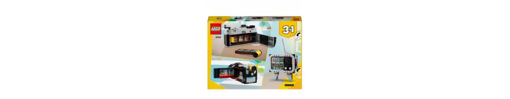 Ten zestaw LEGO® Creator 3 w 1 ze sprzętami w stylu retro umożliwia dzieciom zabawę w budowanie trzech różnych modeli przy użyciu tych samych klocków. Mogą stworzyć zabawkowy aparat, a następnie przebudować go na kamerę lub telewizor z anteną. Wszystkie trzy modele sprawdzą się też jako ozdoba na półkę.