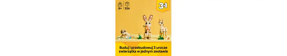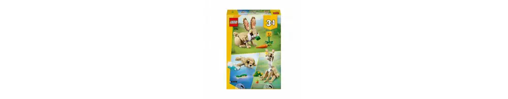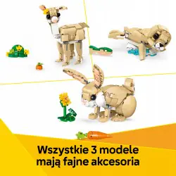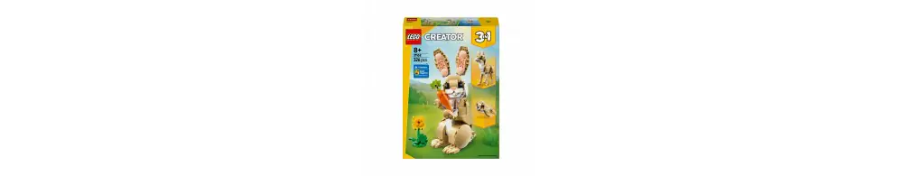 Dzięki zestawowi LEGO® Creator 3 w 1 Uroczy króliczek (31162) ośmiolatki i starsze dzieci mogą odgrywać rozmaite historie. Zawiera on figurkę króliczka z ruchomą głową, uszami, przednimi i tylnymi nogami. Można go ustawić na dwóch lub czterech nogach. Całości dopełnia słonecznik i marchewka dla królika.