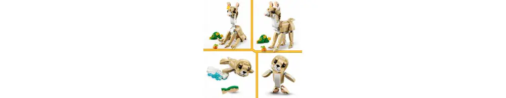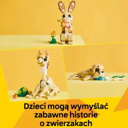 Chłopcy i dziewczynki mogą zbudować trzy różne zwierzątka LEGO z tych samych klocków: ruchomego króliczka ze słonecznikiem i marchewką, lamę ze skrawkiem zielonej trawy i połówką marchewki oraz fokę z taflą lodu i rybą. Wszystkie trzy scenki sprawiają, że będzie to świetny prezent dla dzieci.