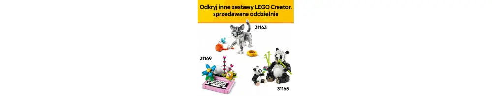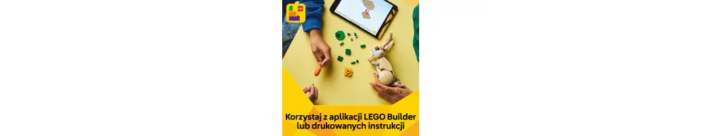 Zestawy LEGO Creator 3 w 1 pobudzają wyobraźnię dzieci dzięki trzem różnym opcjom budowania w każdym pudełku. Dzieci mogą budować i przebudowywać modele bez przerwy. Aplikacja LEGO Builder oferuje nowy wymiar budowania z przyjaciółmi i rodziną. Należy pamiętać, że modeli nie można zbudować jednocześnie.