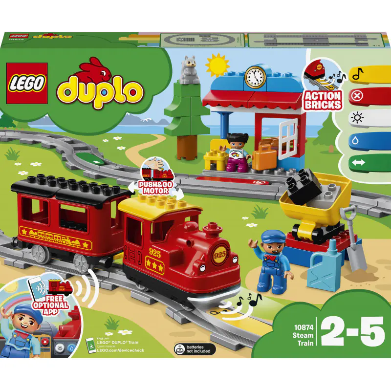 Wystarczy delikatnie popchnąć zabawkę do przodu lub do tyłu, by zaczęła jechać, albo przytrzymać ją lub podnieść, by się zatrzymała. Pomóż dziecku ustawić pięć kolorowych klocków funkcyjnych na torach. Klocki umożliwiają odegranie sygnału dźwiękowego, włączanie i wyłączanie świateł, zatrzymanie i tankowanie, zmianę kierunku oraz zatrzymanie pociągu. Stacja kolejowa, wywrotka z węglem, dwie figurki DUPLO oraz figurka zwierzęcia i nieskomplikowane tory kolejowe z tego zestawu LEGO DUPLO pozwalają na rewelacyjną zabawę klasycznymi pociągami. Opcjonalna aplikacja do pobrania oferuje jeszcze więcej możliwości, w tym funkcję zdalnego sterowania oraz ciekawe zabawy dla Ciebie i Twojego malucha!