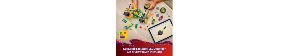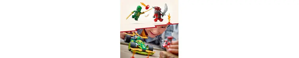 Zestaw zawiera dwie minifigurki NINJAGO: Lloyda z dwiema złotymi katanami oraz złowrogiego dragońskiego wojownika z mieczem, aby dzieci mogły odgrywać ekscytujące bitwy. Zestaw zawiera również dwa elementy świetlne, aby stworzyć mały tor przeszkód dla samochodu wyścigowego.