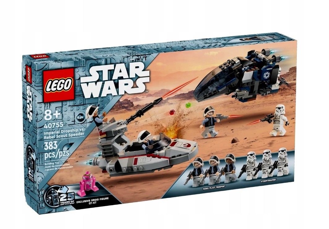 - Sześć minifigurek LEGO® Star Wars™ — trzech szturmowców i trzech żołnierzy Rebelii, każdy z blasterem, a także kolekcjonerska figurka droida QT-KT z podstawką, która powstała z okazji 25-lecia zestawów LEGO Star Wars