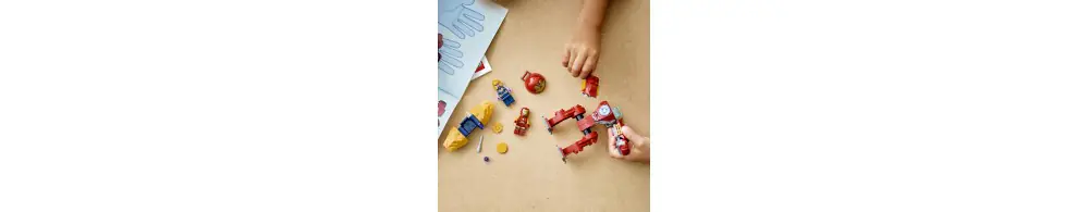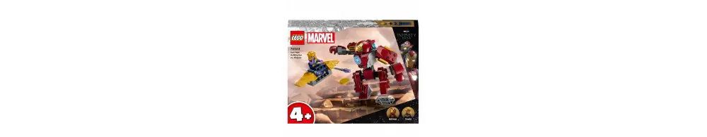 Ten zestaw, oparty na filmie „Avengers: Wojna bez granic Marvela, przedstawia superbohatera Iron Mana i jego mecha oraz superzłoczyńcę Thanosa i jego samolot. Mech Hulkbuster jest w pełni ruchomy i zawiera miejsce na minifigurkę Iron Mana. Samolot ma miotacz dysków i siedzenie dla minifigurki Thanosa. Każda torebka z klockami w pudełku zawiera kompletny model i postać, które dzieci mogą od razu złożyć i rozpocząć zabawę. Kolorowa historyjka z obrazkami służy jako instrukcja budowania, a dwa klocki startowe z nogami mecha ułatwiają rozpoczęcie budowy. Dodatkową cyfrową zabawę zapewnia intuicyjna aplikacja LEGO Builder, w której dzieci mogą powiększać i obracać modele w 3D, a także śledzić swoje postępy.