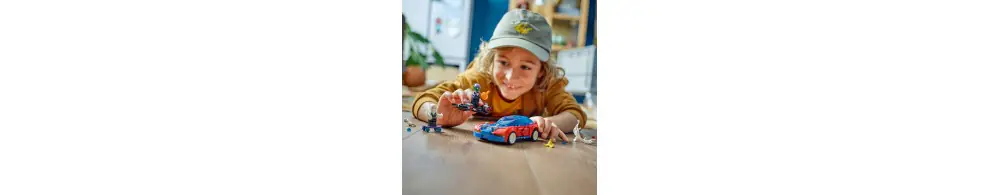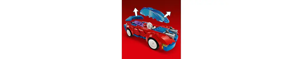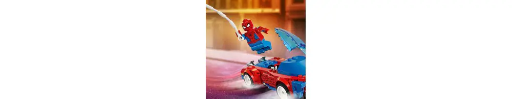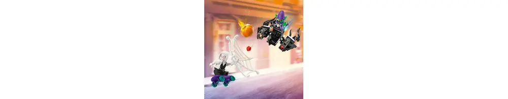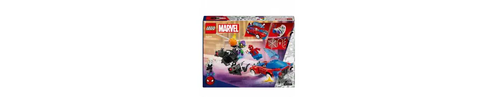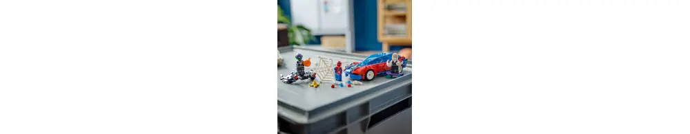 Spider-Man, Ghost-Spider i zvenomowany Zielony Goblin biorą udział w dynamicznych akcjach, korzystając z niesamowitych pojazdów, broni i akcesoriów. Samochód Spider-Mana ma dwa miotacze klocków z przodu, szybowiec Zielonego Goblina ma dwa miotacze klocków i bomby dyniowe, a Ghost-Spider jeździ na deskorolce z ręcznymi miotaczami sieci. Spider-Man huśta się na elastycznej „linie” i używa dużej sieci do łapania złoczyńców. Zdejmowane sekcje umożliwiają dostęp do wnętrza samochodu, które jest wystarczająco duże, aby pomieścić dwie minifigurki i deskorolkę. Dodatkową cyfrową zabawę zapewnia intuicyjna aplikacja LEGO Builder, w której można powiększać i obracać modele w 3D oraz śledzić swoje postępy.