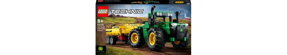 Ośmiolatkom i starszym dzieciom zafascynowanym zabawkowymi traktorami spodoba się zestaw konstrukcyjny LEGO® Technic Traktor John Deere 9620R 4WD (42136). Zaprojektowany we współpracy z firmą John Deere traktor z przyczepą ma sporo realistycznych funkcji. Wyposażony jest w ogromne koła, przegubowy układ kierowniczy i kabinę kierowcy z obracającym się fotelem.