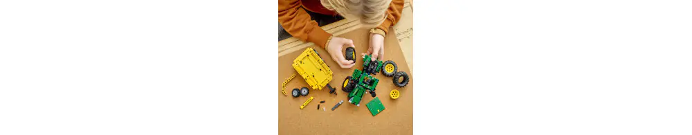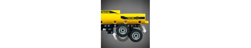 Młodzi miłośnicy traktorów będą zachwyceni możliwością zbudowania własnego traktora John Deere, a podczas składania modelu poznają wszystkie szczegóły działania tej maszyny. Przyczepę można przechylić, co ułatwia przewożenie ciężkich ładunków. Koła nadają się do jazdy po trudnym terenie, a dyszel ma dodatkowy zawias, dzięki czemu przyczepa może z łatwością jechać w górę i w dół stoków.